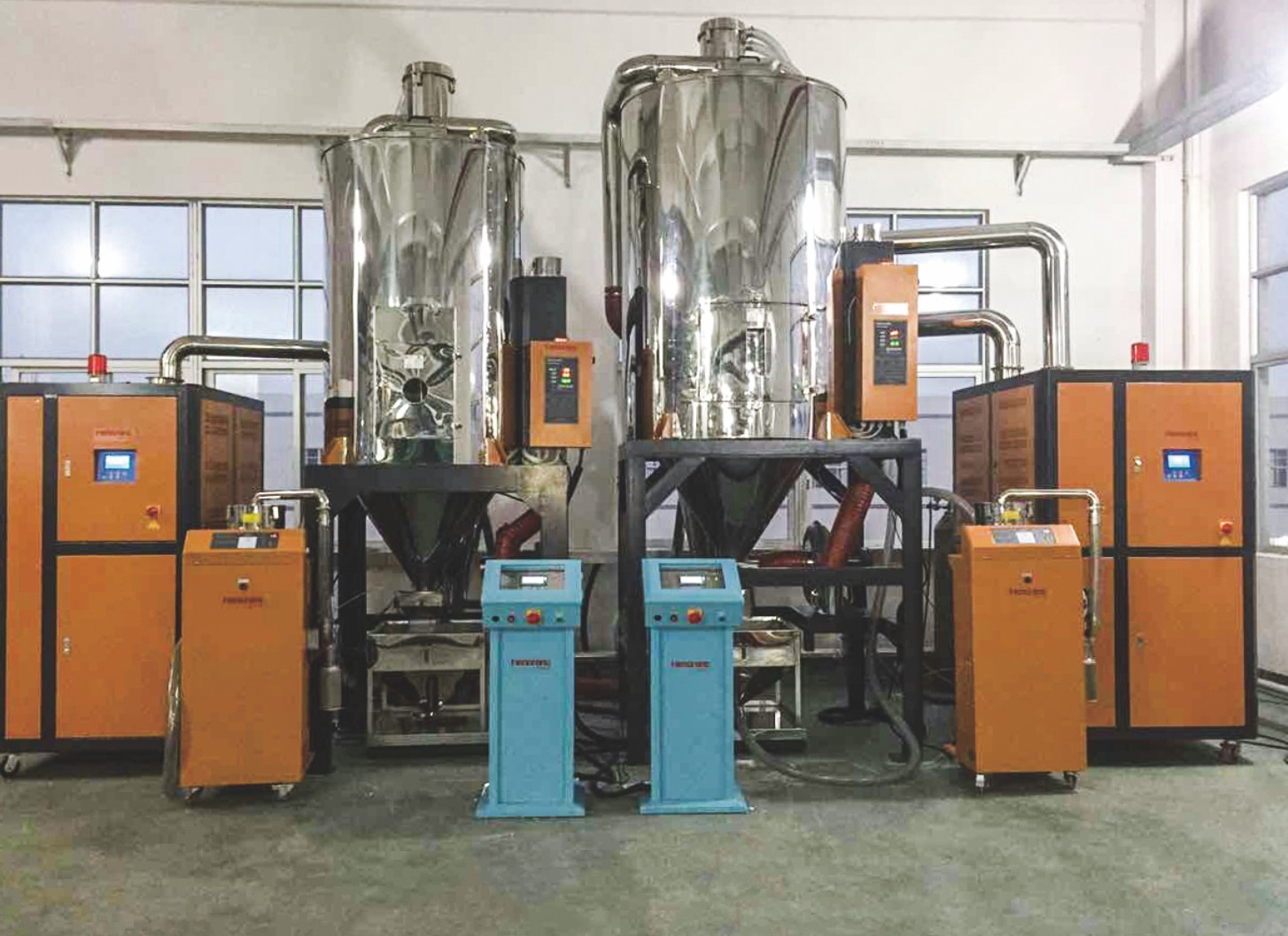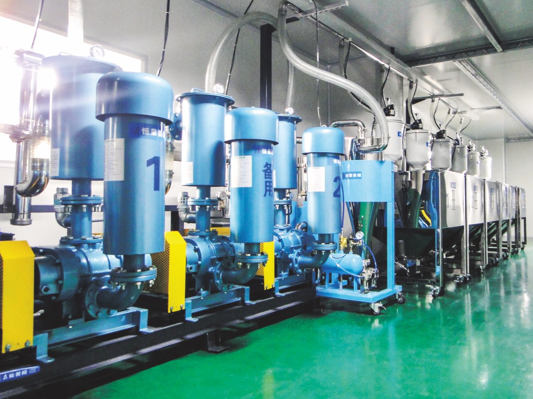 目前,生產(chǎn)干燥空氣最為普遍的方法就是利用干燥氣體發(fā)生器。該自動(dòng)上料系統(tǒng)以由兩個(gè)分子篩組成的吸附性干燥器為核心,空氣中的水分在這里被吸收。在干燥狀態(tài)下,空氣流經(jīng)分子篩,分子篩吸收氣體中的水分,為干燥提供除濕氣體。在再生狀態(tài)下,分子篩被熱空氣加熱至再生溫度,流經(jīng)分子篩的氣體收集被除去的水分,并將其帶至周圍環(huán)境中。